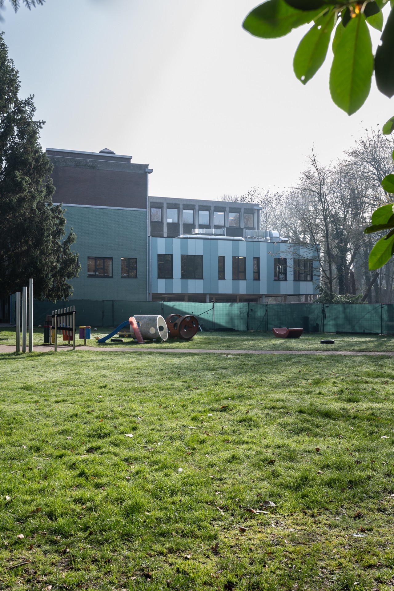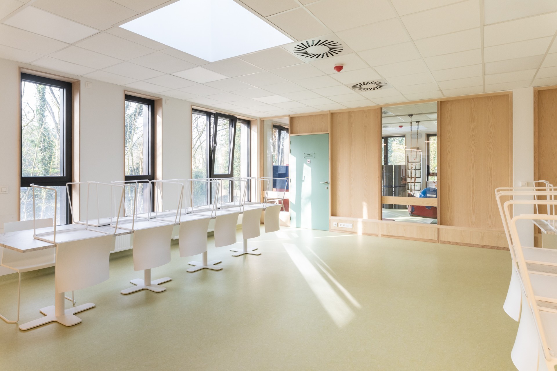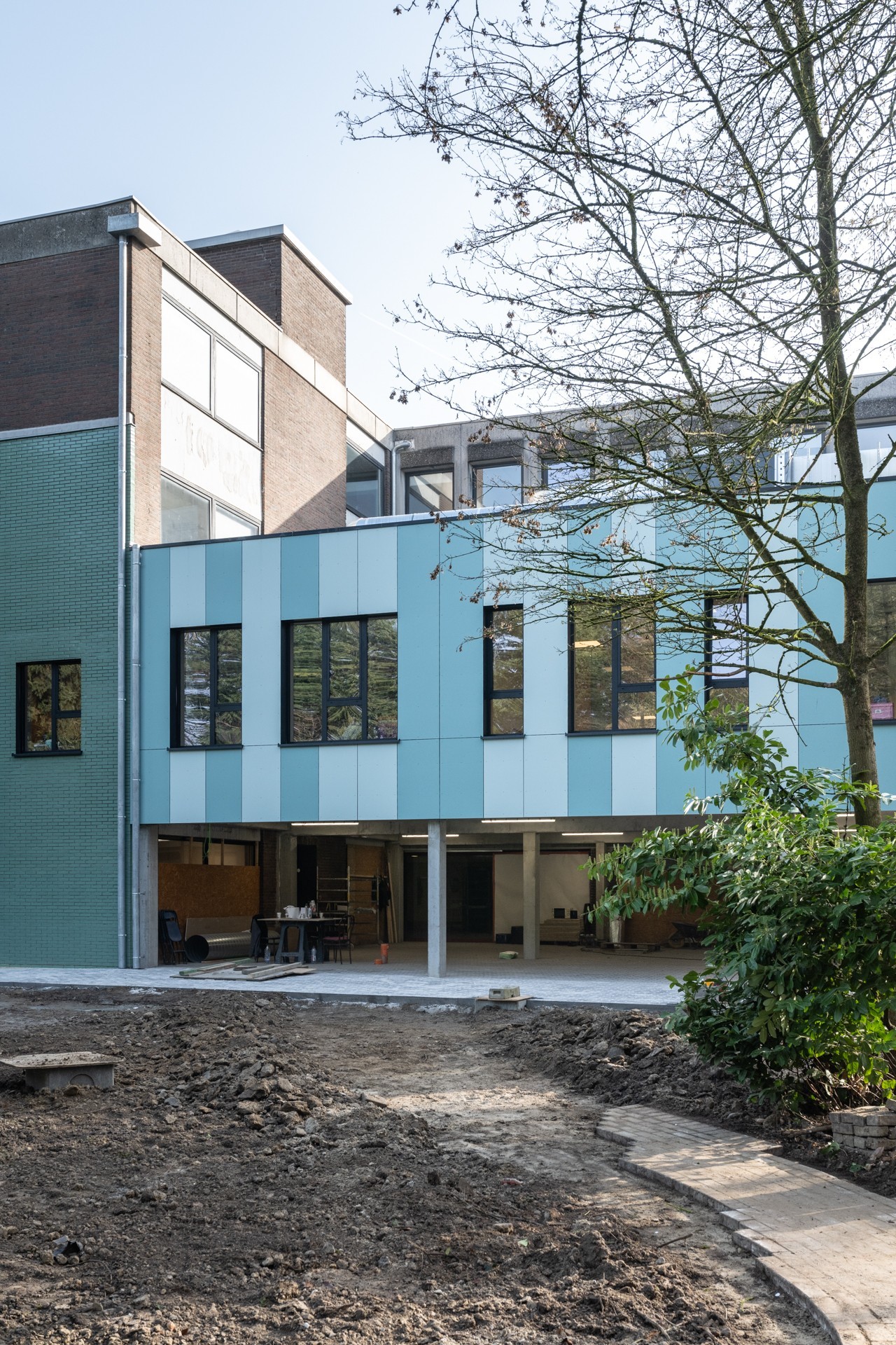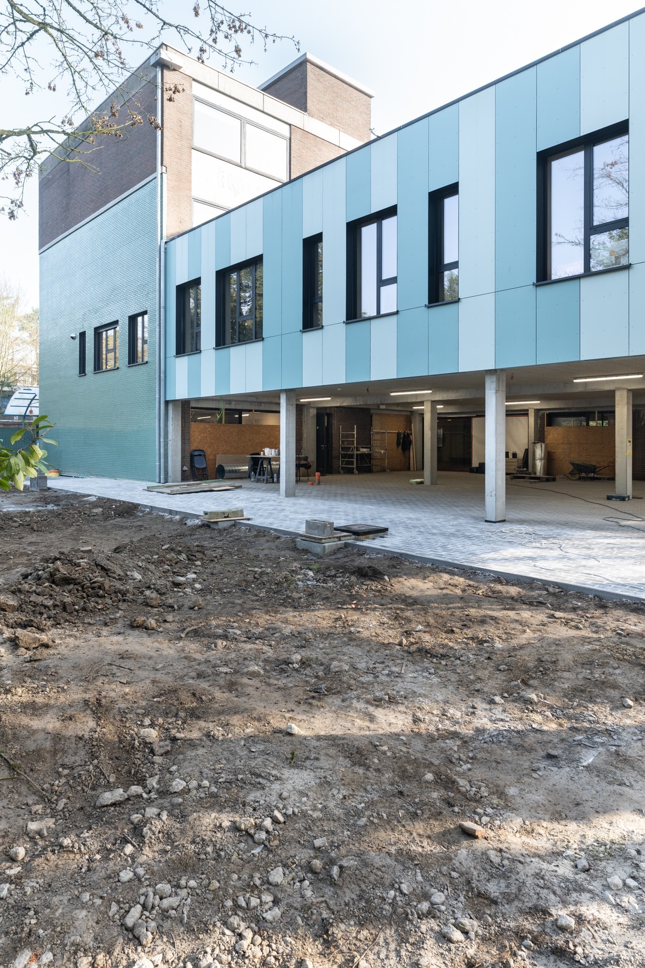 En collaboration avec adn Architectures, nous avons réalisé la rénovation et l’extension des locaux de l’école IRAHM à Bruxelles. Le projet comprend la construction d’une extension à hauteur du réfectoire au premier étage avec agrandissement du réfectoire existant, l’aménagement d’une cuisine ergonomique, la création d’ateliers didactiques et pédagogiques pour les jeunes de l’institut, deux locaux polyvalents, ainsi que l’aménagement d’un préau flexible servant de parking sécurisé et d’espace extérieur couvert.